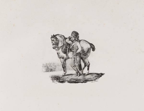 Curator: Look at the weight of this animal, and the dynamism the artist was able to capture with lithography. Editor: Yes, there is an inherent energy that is palpable in this work, a strength so deftly depicted. Here, we have "Horse Crossing a Barrier," a lithograph created by Louis-Pierre-Marie Courtin sometime between 1822 and 1823. It now resides at the Minneapolis Institute of Art. Curator: The interplay of light and shadow is masterfully handled. Consider how the darkness of the horse contrasts with the stark white background. This serves to emphasize the animal’s form. The precision with which the artist details the horse’s musculature is simply remarkable. Editor: I agree that the medium serves this goal but how does the context, the tools available affect its production? Knowing more about lithography processes of that time might allow one to explore Courtin's role as laborer and technician here. There are constraints. He has to be pragmatic and skilled. This impacts the composition. Curator: Of course. But note, how the composition directs our gaze. The placement of the barrier—off-center yet pivotal—divides the image plane, creating spatial tension. It’s not merely a representational scene; the forms achieve a deeper sense of meaning. Consider the geometry inherent in the barrier’s construction. Its angles and lines provide a subtle counterpoint to the horse’s organic form. The interplay heightens the feeling of movement. Editor: Right, the horse dominates, but it's a scene of subjugation: the barrier exists for its limitation. Also, one considers where the lithographic stone itself originated. Did this medium and scene of an active animal provide the public of the 1820s something unique as prints circulated more broadly? Curator: It invites reflection on our role in interpreting and responding to artistic expressions. Editor: A reminder that even art's beauty emerges from labor and constraint, prompting us to explore beyond the surface.