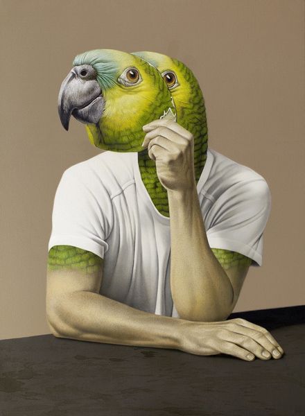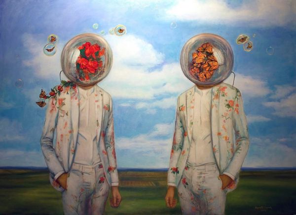 Carlos Sablòn made this painting, Le bon copain, with what looks like thin layers of oil paint, built up slowly. It’s a real slow burn, this one. The whole thing has this slightly surreal vibe, right? A figure with a palm tree for a head, hand on his chest, like he's taking an oath, or maybe about to burst into song. Then there is the hand gently resting on a small dog. I mean, what's not to love? Look at the paint itself – it's smooth, almost glassy, but there's a subtle texture, especially in the sky. You can almost feel the brushstrokes, the careful blending. And that light! The way it catches the leaves of the palm tree, the folds of the shirt… it's all so deliberate, so precise. Like a dream caught in amber. I'm thinking of artists like René Magritte, maybe Giorgio de Chirico too. They all had this way of making the familiar strange, the everyday uncanny. And that's what Sablòn's doing here, creating his own little world, full of mystery and magic.