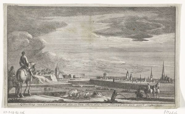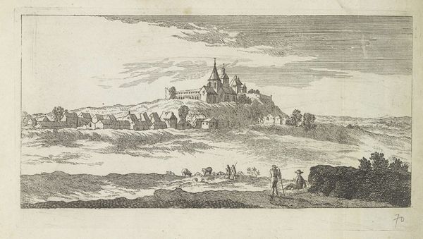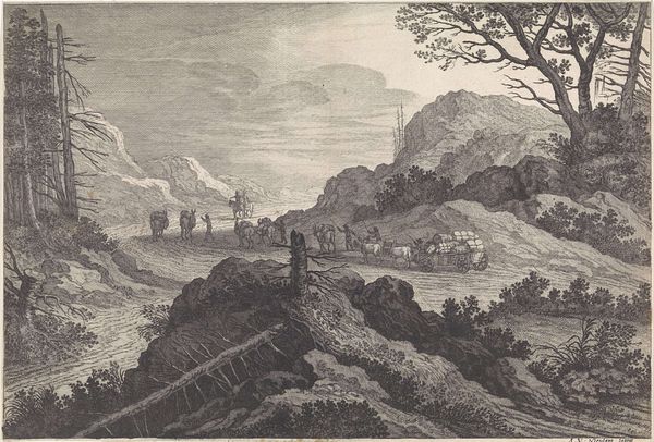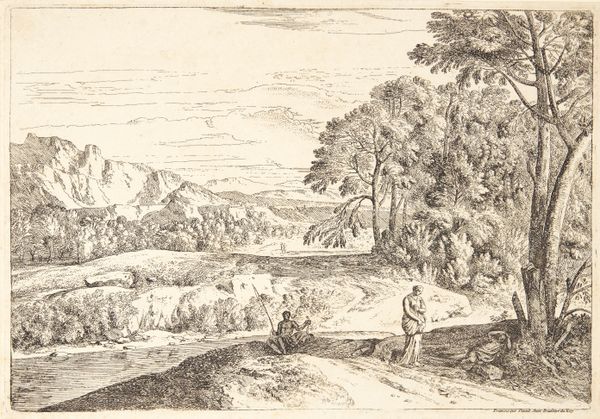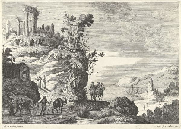 Curator: This captivating ink and engraving drawing is titled "Italian Coastal Landscape," believed to have been created between 1635 and 1650 by Willem van Lande. It evokes a compelling atmosphere, doesn't it? Editor: It certainly does. Immediately, I see a pastoral scene suffused with a kind of nascent longing. There's a quaint village nestled at the base of a hill near the water, with figures who appear as though they might soon embark on a journey. Curator: I agree. The depiction of everyday life is key here; you can really see Van Lande responding to the growing urban centers in the Netherlands by creating idealized images of nature and leisure. Images that promoted the commercial possibilities of their landscape painting and printmaking on a European stage. Editor: And what's remarkable to me is how these detailed images also subtly carry deeper symbolic weights. Notice the compositional positioning of those foreground travelers. Their posture directs our eye straight towards the radiant burst of the rising, or setting, sun. Curator: An interesting detail. Such carefully constructed elements speak to a desire for audiences, perhaps those who knew about or experienced the devastation of plague in the major centers, to enjoy an escapist fantasy of nature and small scale labor, with all its social complexities removed or idealized. Editor: Yes, the simplification is key. Note, also, how nature itself is presented almost as a stage set: those meticulously placed trees on the left act as visual anchors, grounding the rest of the imagined Italian panorama for our eyes. They evoke something deeper for the mind as a viewer: the natural world offering solace from earthly suffering, for which these laborers may well be rewarded in the life beyond if their Christian service to the landscape is faithfully practiced. Curator: You know, by imbuing the work with such potential allegorical or even biblically inspired undertones, van Lande was ensuring the painting appealed to diverse tastes across social classes and religious beliefs during a tumultuous historical period. Editor: Absolutely, these landscapes go beyond mere surface representations. It is the perfect meeting between place and feeling. The work becomes something akin to a complex mirror, reflecting culture as a promise of salvation. Curator: A really fascinating analysis. It reminds us to see artworks such as these, no matter their surface simplicity, as documents deeply shaped by socio-economic realities, far removed from any romantic visions of rural life. Editor: Exactly! The most apparently simplistic scenes can become richly resonant windows into human history when viewed from a thoughtful and informed perspective.