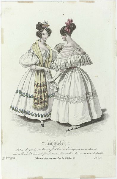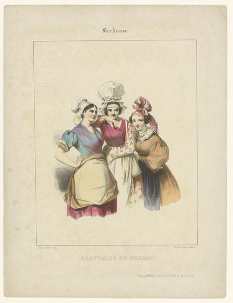 Editor: This is "Fashion Plate: Three Ladies" by Célestin Deshays. It's hard to pin down the exact date, but the dresses really give it a sense of period. What symbols or hidden meanings do you find in their attire? Curator: Look at how their bonnets frame their faces, almost like halos. The elaborate layering of fabric speaks of status, but also, perhaps, of constraint. Do you see a tension between display and confinement in the image? Editor: I hadn't thought about it that way, but now I do. It's like the clothing is saying one thing, but the women themselves might be feeling something else. Curator: Exactly. Consider how clothing acts as a form of social encoding, silently broadcasting messages about identity and belonging. What stories do you think these women are telling through their fashion? Editor: This makes me look at fashion plates in a totally different light. Thank you! Curator: It is wonderful how we can see history through the language of clothes.