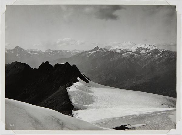 Editor: This photograph, "Fytnargin Glacier, Central Caucasus," is by Vittorio Sella. The starkness of the black and white gives it such a grand, almost ominous feel. What do you see in this sweeping landscape? Curator: It's interesting you say ominous. I find a strange comfort. Sella's framing makes me think of a stage, where the glacier is both actor and setting, eternally performing this slow, powerful dance of ice. Does that resonate? Editor: I can see that. It's like the glacier has a story to tell, a really long one. Curator: Exactly! And the story is written in light and shadow, each crevasse a line of dialogue. Perhaps it’s a saga of resilience, or a lament for a world in flux. What do you think? Editor: I think it's definitely made me rethink glaciers, that’s for sure. Curator: Me too. Let’s go explore!