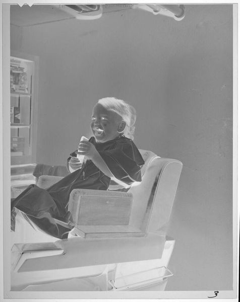 Editor: So this is an untitled photograph, "boy on couch," by Lucian and Mary Brown. The image is a negative, which gives it an eerie feeling. What's your read on this photograph, especially the choice to present it as a negative? Curator: Well, the use of a negative inherently distances the viewer. It transforms the familiar domestic scene into something alien. This could be a commentary on the representation of childhood, perhaps hinting at hidden anxieties or societal expectations placed upon children, viewed through a distorted lens. What do you think? Editor: I didn't consider that the artists are commenting on childhood itself, that's interesting! Curator: The format makes the image feel clinical, don't you agree? The image might also speak to the politics of image-making. By presenting the negative, the artists are revealing the constructed nature of photography itself. This makes us more aware of the photographic process. Editor: Right, so it is not just a snapshot of a boy. It’s a deconstruction. Thanks!