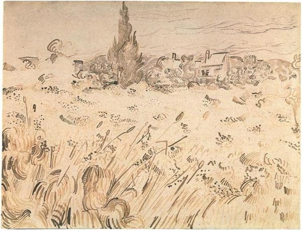 Editor: Here we have Van Gogh’s “Wheat Field with a Stack of Wheat or Hay” from 1890, rendered in pen and ink. It’s mostly monochromatic. What strikes me is how the lines seem to dance, especially around the haystack itself. How do you interpret this work from a formal perspective? Curator: Indeed. Note the masterful application of line, varying in thickness and direction, to create both texture and form. Van Gogh's use of hatching and cross-hatching is not merely descriptive. Observe how the density of the lines defines the spatial recession from foreground to background. Consider the visual rhythm established by the repeated vertical strokes that form the wheat stalks. Do you perceive any disruption to this rhythm? Editor: I see that the haystack, with its swirling, almost chaotic lines, breaks that rigid verticality. It introduces a sense of dynamism. Curator: Precisely. That contrast between the structured field and the amorphous stack creates visual tension. The composition pivots around the interplay between the linear precision in the lower portion and the more expressive, gestural strokes describing the hay. Also, we cannot dismiss the negative space, especially in the sky above, as an active component in the design and overall effect. Editor: So it’s almost like a conversation between order and chaos within the structure of the piece? Curator: Exactly. The structural components, though seemingly simple, embody an intentional, rigorous exploration into formal oppositions. I am especially taken with the bird sketched in the far left that, to me, signals that Van Gogh wanted to indicate some amount of temporal passage, too. What new perspective do you now find, after considering the form so deeply? Editor: Seeing it broken down like this reveals the intention behind every stroke; not just depicting a field, but exploring ways to build form, rhythm, and texture. Curator: Form indeed is everything, or nearly.