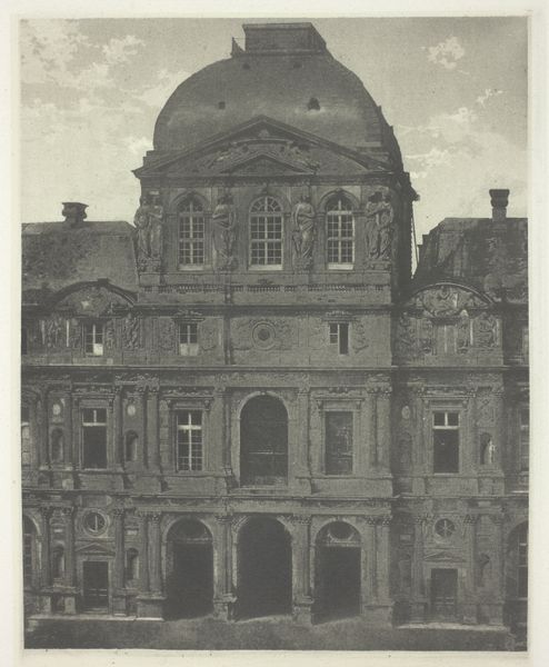 Editor: Here we have Edouard Baldus’s photograph, "Pavillon de l'Horloge, Louvre," taken between 1852 and 1853. The monochrome tones lend the structure a monumental air. What formal qualities strike you most powerfully in this composition? Curator: The geometry evident within this photographic representation holds significant interest. Baldus has skillfully captured the Louvre's facade. Note the proportional relationships between the architectural elements, particularly how the lower arcade supports the ornate upper stories, culminating in the hemispherical dome. Consider how light interacts with the texture of the stone; shadow and highlight articulate depth and volume. Do you perceive any tensions or harmonies within this arrangement? Editor: I see both, actually. There's harmony in the repeated shapes, the arches and windows, but tension in the contrast between the detailed carvings and the plainer surfaces. The lighting really emphasizes that contrast too. Curator: Precisely. This interplay is a manifestation of neo-classicism's visual vocabulary—a striving for balance through carefully calibrated opposition. How does Baldus manipulate the perspective and framing to emphasize this reading? Editor: It looks like he’s chosen a viewpoint that emphasizes the symmetrical composition and allows us to really appreciate all of its details and decorations. The framing leaves out extraneous visual information. Curator: Indeed. He concentrates the viewer’s focus upon the building's inherent order, creating a space that emphasizes structural elegance and the interplay of shapes. Have your perceptions shifted during this conversation? Editor: Absolutely! I was initially drawn to its simple grandeur. But now I am struck by the strategic design choices that create depth and visual interest in it. Curator: Analyzing formal elements grants us enhanced understanding and new depth of meaning. It’s a beneficial method to consider the intrinsic details of a composition, wouldn’t you agree?