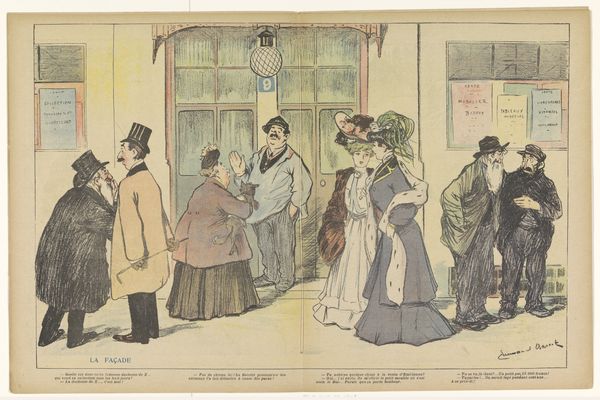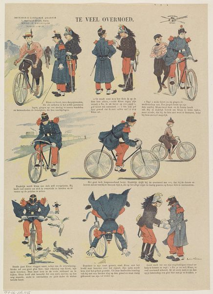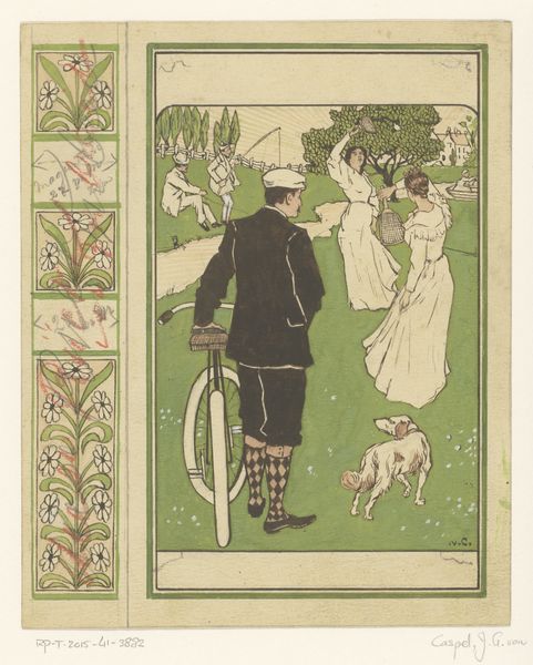 Curator: Here we have “Hamers Rijwielen,” a poster created around 1912 by Johann Georg van Caspel. The work is a mixed-media print, rendered in a distinctive Art Nouveau style. Editor: It has such a feeling of leisurely modernity to it! The figures on bicycles, framed by what looks like a breezy landscape. Are those windmills I see in the distance? There is also this flatness of color. This work feels designed to sell freedom and ease, above all. Curator: Absolutely. Consider the bicycle itself. By this period, cycling symbolized emancipation, especially for women. Notice their dress—it conveys activity and forward movement. There's a psychological shift visible, too, a break from older forms of social constraint. The bicycle here suggests a release of repressed societal conventions. Editor: Indeed, this poster makes me consider the material culture of leisure at the time. These bicycles were being mass-produced, but they still had a symbolic weight. Each detail, from the clothes people wore while cycling, to the posters themselves, implies a growing middle class with both purchasing power and leisure time. The layers of consumer culture, starting here, begin to seem complex indeed! Curator: Observe too how the linear procession of figures reinforces the notion of forward progress. It’s not just physical mobility, but social mobility implied as well. We have here a visual embodiment of optimism, a collective movement towards an imagined better future, driven by technological innovation. Editor: It is easy to think of “progress” being inevitably positive. But I think about how advertising plays on desires and anxieties—does it offer solutions, or simply more desires? Regardless, the medium is definitely the message in "Hamers Rijwielen". It's interesting to see the dawn of these manipulative marketing practices as technological progress moved so many objects into mass consumption. Curator: An astute observation. The interplay between the ideal and the reality… I leave with renewed thought about our continuous negotiation between technology's promises and its impacts. Editor: I agree. Considering the poster through the lens of labor and consumption makes it clear that these marketing materials are never neutral objects, always implicated in broader power dynamics.