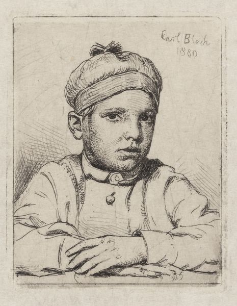 Curator: This compelling drawing, rendered in pencil on paper, is entitled "Drengeportræt, 3/4 profil mod venstre"—"Boy Portrait, 3/4 Profile to the Left." It's the work of Joakim Skovgaard and dates to 1872. Currently, it resides here at the SMK, Statens Museum for Kunst. What strikes you when you look at it? Editor: He looks… serious, doesn't he? Almost like he’s contemplating the state of the world. Or maybe just whether he'll get dessert. There’s a vulnerability there, too, in the soft shading around his eyes. It’s deceptive, this level of emotion captured with just a pencil. Makes you wonder about the story behind those eyes. Curator: It's precisely that capacity for realism to convey profound interiority that's so significant. The work enters into discourses of childhood, and representation, opening dialogues around power and the gaze. Think about how Victorian notions of childhood—innocence, potential—inflect Skovgaard's approach. We have to be conscious about considering the socio-political role of art in that period. Editor: Totally. Though, forgetting all that for a second, doesn't he remind you of a slightly grumpy cherub? The way his face is so round, those little hands… but I see what you mean. It's impossible to separate any portrait from its context, the power dynamic inherent in observation. Especially here, when it's an adult representing a child. You can see a tension in trying to catch that fleeting innocence that maybe isn’t really all that innocent. Curator: The artist walks that tightrope skillfully, don’t you think? The detailing around the collar, for example, provides material context – class, perhaps – while also subtly shifting our focus from idealized cherub to something much more anchored in lived experience. This invites questions. Was this a commission? A study? An act of affection? And, moreover, for what intended audiences? Editor: Right, and by drawing attention to the realities of a young boy and suggesting that, as a boy, his identity will have to navigate external social expectations in the 19th century, the work becomes, almost inevitably, politicized. I wonder what became of him? Curator: Indeed. What we bring to a work invariably alters the way it speaks. It is a wonderful reminder to stay inquisitive about the work while being very much alive to the socio-political environment and conditions that gave rise to the aesthetic properties we're so moved by. Editor: Yeah. For me, looking at this, I am more in touch with the universal aspect, the fleetingness of childhood, that in itself brings up such powerful sentiments of political concern with social circumstances for children. I think Skovgaard captured that so profoundly with minimal means, it’s almost dream-like, with a certain nostalgic ache for the ephemeral nature of growing up.