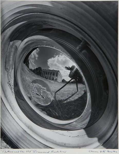 Editor: This is György Kepes's photograph, "Berlin," from 1930. The city scene is strikingly captured in black and white, but it is viewed from an angle, or from a window in a tall building perhaps. It feels somewhat detached and sterile due to the high angle of the shot, which lends it an incredible flatness, but I’m fascinated by its stark geometries. What do you see in this piece? Curator: From a formalist perspective, the photograph compels us to deconstruct its arrangement of lines and shapes. Note how the tram lines bisect the frame diagonally, creating a series of interconnected geometric forms. How does this structure dictate our interpretation of the whole image, do you think? Editor: The lines give structure, but they are also visually compelling. Curator: Indeed. Observe, also, the tonal contrasts—the interplay of light and shadow which accentuate the flatness you have noticed. What impact does the contrast of dark and light have? Editor: The darker foliage at the lower left almost acts as a grounding element, juxtaposed with the stark planes of the street, and provides a powerful tension. Curator: Precisely. Kepes isn't simply documenting Berlin, but creating a carefully constructed visual experience. This interplay of textures and forms within a flattened perspective is what defines the image's expressive qualities. What have you learned in our exchange today? Editor: Focusing on the lines and shapes emphasizes that the photo is more than a scene; it's a designed composition with strategic tonal arrangements. Curator: Exactly. Analyzing artwork at its basic forms provides an avenue for a new way of interpreting it.