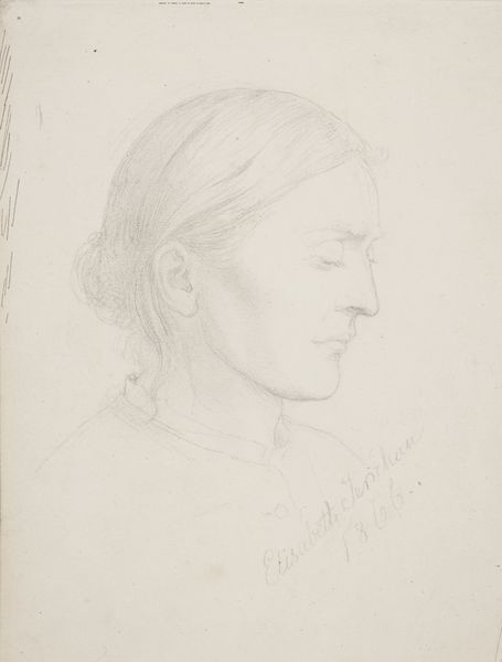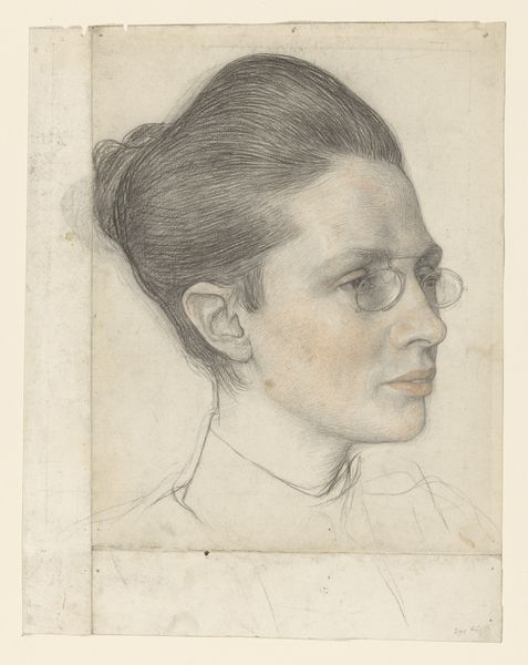 Editor: So, this is Fritz Boehle's drawing, "Woman's Head." It looks like a pencil drawing on paper, and it's housed here at the Städel Museum. It's got this incredibly subdued, almost melancholic mood to it. What do you see when you look at this piece? Curator: It’s as though Boehle has captured a fleeting moment, a private reverie. The soft, smudged lines of the pencil give her face a vulnerable quality. I wonder what story she holds. The drawing has a subtle intensity... like she is looking into another world entirely. Have you ever seen that quality in another portrait? Editor: Maybe... I'm thinking of some of the more introspective portraits by Käthe Kollwitz? Curator: Ah, an excellent comparison! There's that same sense of quiet contemplation. With Boehle, though, I see an almost classical grace, even in the simplicity of the lines. But why do you think Boehle chose the starkness of pencil for this particular subject? Editor: Maybe to emphasize her naturalness, that quiet intensity you mentioned. It feels very immediate, like a captured moment. Curator: Exactly! The lack of color creates a sense of intimacy, drawing us closer to her inner world. And that scrap of handwriting… is it perhaps a key? A piece of a lost narrative? A memory of how and why he produced the piece? Editor: It adds such a layer of mystery. It makes me wish I could read old German script! It seems to imply that portraits aren't just about likeness. Curator: Precisely! They are about a feeling. And about a relationship, even an imagined one. I keep thinking it is her dream we are peeking at. This piece continues to be an object to explore. Editor: This drawing definitely has given me a fresh look at portraits, the subtlety that a simple medium brings to the fore!