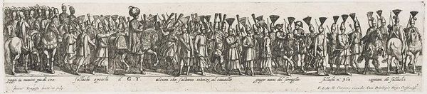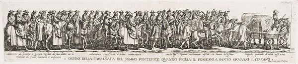 Editor: This print, "Procession of the Pope to St. John Lateran" by Antonio Tempesta, shows a long parade rendered with incredible detail. I'm struck by how it captures the scale and spectacle of religious power. What can you tell me about its historical context? Curator: This print offers a window into the performative aspects of the papacy and its relationship to Rome. Consider how Tempesta, by depicting this grand procession, reinforces the visual rhetoric of papal authority within the city's socio-political landscape. How do you think this imagery functioned for its intended audience? Editor: It seems like it was meant to impress, to showcase the Pope's power and influence through public display. I learned a lot about the role of art in shaping perceptions of authority!