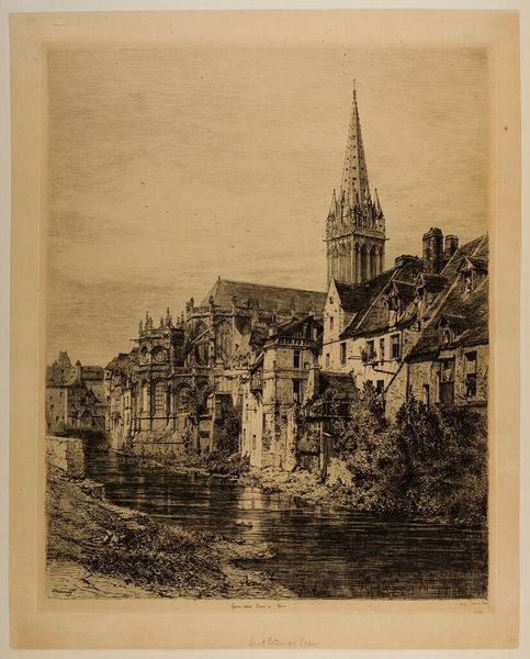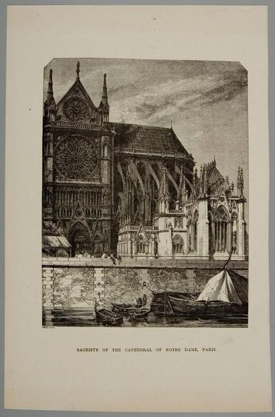 Curator: Alfred Louis Sargent’s "View of the Cathedral of Basel" captures the impressive architecture from a waterside perspective. The exact date of its creation remains unknown. Editor: It feels both imposing and strangely fragile. The detail is incredible, but the monochromatic palette gives it a feeling of distance, almost like a memory. Curator: Indeed. The choice of perspective positions the viewer outside, looking in. This reinforces the cathedral's role as a central institution within the city, both physically and culturally. Editor: And who is being included in that culture? The two figures in the boat seem deliberately small, emphasizing the scale of the cathedral and the power it represents. I wonder about the experiences of the marginalized within its shadow. Curator: A valid point. The cathedral, throughout history, has often been a symbol of both spiritual solace and social control. This image invites contemplation on that duality. Editor: It is striking how the architecture dominates the natural landscape. It almost feels like the city and church are imposing themselves upon the river. Curator: It's a reminder that art can be a potent record of societal values and power structures. Editor: Precisely, I am left considering which voices are amplified and which are muted in this historical portrayal.
