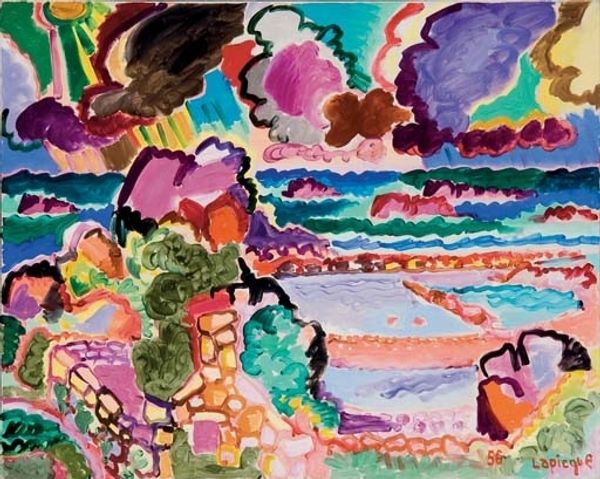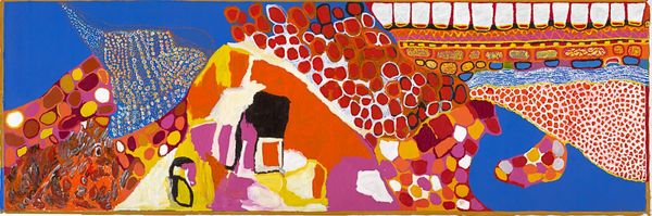 Curator: What a vibrant, albeit puzzling, mixed-media work we have here. This is “In Anticipation” by Charles Garabedian, completed in 1988. Editor: My first thought is 'organized chaos.' There's figuration battling abstraction on multiple fronts. It feels busy, almost anxious—that tension practically vibrates off the canvas. Curator: Absolutely, that tension seems intrinsic to Garabedian's process. He often incorporated disparate images and patterns, creating works that felt simultaneously chaotic and carefully constructed. Considering the socio-political climate of the late 80s, the art world moving between neo-expressionism and the Pictures Generation, perhaps there's a commentary on the splintering of identity or societal anxieties at play. Editor: I see that. He was working in a moment of significant change and I would suggest the mixed-media approach speaks to that kind of shifting ground. And while it may appear chaotic at first glance, I note how Garabedian contains everything within this rectilinear patchwork of pattern and recognizable if somewhat awkwardly rendered figures. There’s even a dog, if you can believe it. I am wondering, given your focus on social contexts, do you see a narrative relating to the reception of art in the late 20th century embedded here? Curator: The presence of classical busts interspersed among cartoonish imagery hints at Garabedian's interest in challenging established hierarchies within art history itself. Perhaps he is suggesting a leveling of culture, an embrace of "high" and "low" forms. If we extend this even further, he is maybe interrogating the identity constructs as expressed within societal conventions. The figures look oddly trapped behind patterned barricades, but in some kind of open terrain. Editor: That really changes my perception. I was focused on the dissonance and this fragmentation, but considering your observations around social identity and its expression as cultural artifact… it makes me think about the politics of the gaze and the way historical power structures affect both artistic creation and reception. A compelling work. Curator: Yes, this examination enriches the impact, inviting us to reassess how we assign meaning. Thank you for your illuminating perspective. Editor: And thank you—I find that your approach grounds my own thoughts. I would be likely to move on, were I to confront this on my own, and maybe be dismissive because of its fractured elements. Now I can appreciate that there's complexity to that perceived chaos.