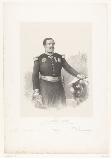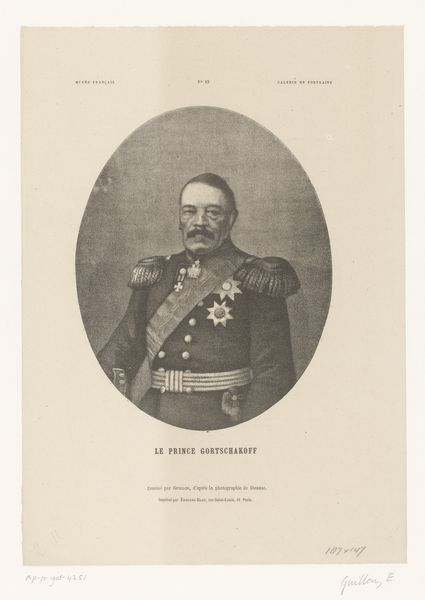 Curator: This lithograph, titled "Portret van Napoleon Eugène Lodewijk Bonaparte," was completed in 1849 by Émilien Desmaisons and is housed here at the Rijksmuseum. It strikes me immediately as austere. The grey scale, the precise rendering...it conveys a sense of restrained power. What are your initial impressions? Editor: There's an undeniable sense of calculated gravitas here. The regalia, the careful attention to his expression...it's all designed to project an image of imperial authority, harking back to the visual language of Roman emperors. That sash, for instance, and the crisp, neoclassical rendering. Curator: Precisely. The limited palette focuses the eye on form and texture. Note the intricate details of the uniform—the epaulettes, the high collar—rendered with remarkable clarity considering it’s a lithograph. This focus serves to amplify his physical presence, wouldn’t you agree? Editor: Undeniably. Consider the rosette on his chest—it signifies order and legitimacy, a clear attempt to associate himself with established power structures and quell any lingering doubts about his claim. Curator: True, it’s a carefully constructed image that echoes the neo-classical revival style in early photography. It also seems intended for mass reproduction, not as unique image or singular artistic accomplishment. Editor: The artist strategically employs symbolic visual language. Even the subject’s pose contributes to the overall message. It’s as if Desmaisons understood the power of photography to not just document, but to actively construct a particular narrative around Napoleon Eugène Lodewijk Bonaparte's image and legacy. It served as potent propaganda. Curator: Agreed. It provides valuable insights into the ways in which photography was then employed to influence public opinion and perception, especially during politically volatile times. This photograph, then, stands as both document and declaration. Editor: Indeed. It’s a stark reminder of how deeply symbols penetrate, consciously or unconsciously shaping perceptions. Curator: Looking closely at its visual organization provides a fascinating glimpse into its carefully orchestrated message.