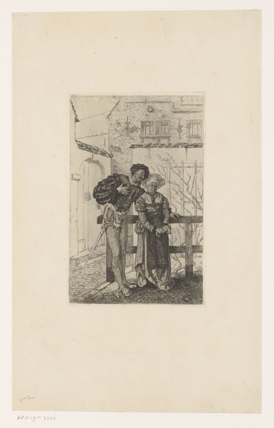Oreste Cortazzo created this etching titled "Groep Italiaanse muzikanten onder een balkon." Observe how the stark contrast of blacks and whites captures the eye, immediately framing the subjects and creating a dynamic interplay between light and shadow. The musicians are arranged asymmetrically. This is a deliberate choice that disrupts a conventional, balanced composition. The linear quality of the etching emphasizes the architectural backdrop and the figures' forms. The formal construction of the artwork invites us to deconstruct established artistic expectations. The composition lacks a clear focal point, challenging the traditional hierarchy of elements. The etching lines, meticulously placed, create a semiotic interplay, where each stroke signifies texture, light, or form. Ultimately, Cortazzo’s use of contrast and asymmetry serves not merely as an aesthetic choice but as a commentary on the fluidity of representation.