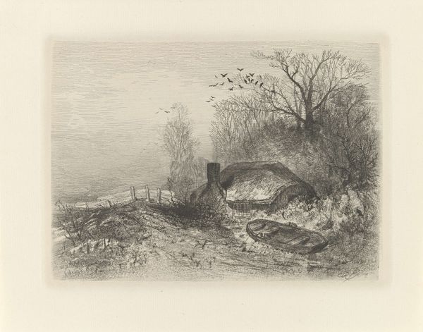Curator: Sir John Charles Robinson, active during the latter half of the 19th century, presents a study in contrasts with his etching, "Newton Manor." Editor: It feels gloomy. Is it supposed to depict a storm coming in, or maybe the long shadow of industrialization creeping over the countryside? Curator: Note the artist’s use of hatching and cross-hatching. Consider how the density of lines evokes atmospheric perspective, guiding the eye through the composition. Editor: The livestock in the foreground juxtaposed with the dilapidated structures suggests a commentary on rural decline, perhaps a critique of the economic disparities of the era. Curator: The technical skill is evident in the modulation of light and shadow, creating a visual experience that transcends mere representation. Editor: Absolutely. It's a hauntingly beautiful, if somewhat disheartening, snapshot of Victorian England and a reminder of its social contradictions.