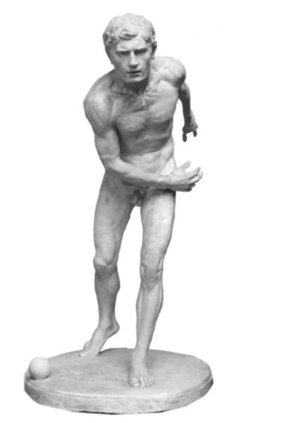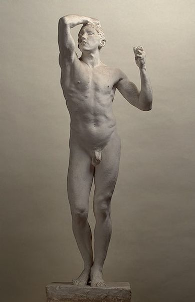 Editor: This is "The Hunter", a bronze sculpture by Svend Rathsack, created in 1941. There is a stark and classic feel to it, which gives the piece an ageless and enduring quality, particularly in the figure’s strong, athletic build and pose. What visual aspects stand out to you most prominently? Curator: Observe the statue's smooth surfaces. How does that surface contribute to your reading of the Hunter’s heroic nature, particularly given the formal properties of light as it interacts with the form? Editor: I think it emphasizes an idealized physique and amplifies the sense of serene nobility in this sculptural rendering. The bronze, smoothed to a gleam, appears untouched, flawless, elevating it. Can we relate that aesthetic back to Classical Realism? Curator: Precisely. Consider the pronounced musculature and its contribution to the sculpture's dynamism. Also consider how the use of contrapposto, evident in the shift of weight and the opposing twist in the shoulders and hips, animates the figure. It all speaks to classical ideals. Editor: The slight asymmetry created through this contrapposto definitely injects some life into what could otherwise be quite static. What purpose does that tension fulfill here? Curator: It compels the eye to move throughout the composition, preventing stagnation and instead creating a dynamic interplay between the body's various components, enhancing the viewing experience. Editor: That interplay gives me a deeper appreciation for Rathsack's technique and intentional design. Curator: Indeed, observing such compositional decisions offers a richer encounter with this powerful sculpture.