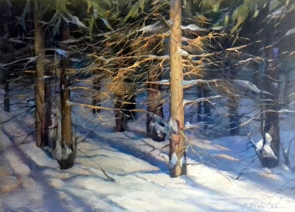 Editor: So, this acrylic on wood painting is called "Shadow," created by Neil Welliver. It's a landscape depicting a winter scene, and I'm immediately struck by the stark contrast between the white snow and the shadows. How do you interpret this work, considering its emphasis on realism and nature? Curator: This piece provides an opportunity to discuss humanity's relationship with the natural world, specifically through the lens of land ownership and environmental impact. How do we as humans perceive ourselves as part of nature, or as separate from and even dominant over it? Consider Welliver’s choice to paint "en plein air," directly experiencing the landscape, yet capturing it for perhaps a more urban, elite consumer. Does this become a romanticized, almost fetishized, vision of nature? What social classes are reflected in paintings like this? Editor: That's an interesting angle! I hadn’t considered the power dynamics at play. I was initially focused on the formal elements. The composition, with its layering of trees and snowdrifts, seems almost like a barrier. Curator: Precisely! And who are these barriers for? Think about accessibility, both physical and social. A snowy landscape can be treacherous, excluding some. Consider how landscape art throughout history has often been used to assert ownership, claim territory, and solidify class divisions. Does Welliver subvert this, or perpetuate it, even unintentionally? Editor: I see what you mean. It definitely shifts my perspective from simply appreciating the beauty of nature to questioning who has access to it, both in the painting and in reality. Curator: Exactly! Art should make us question, challenge our own assumptions, and confront the complexities of our world. Understanding the history and socio-political context in which artwork is produced and viewed is really a radical act, don't you think? Editor: Definitely. Thanks for opening my eyes to these deeper meanings. I'll never look at a landscape painting the same way again.