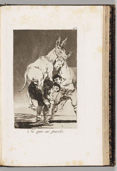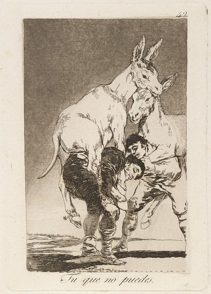 Curator: This is Francisco Goya's print, "Thou Who Canst Not," housed here at the Harvard Art Museums. It immediately strikes me as a study in futility. Editor: Yes, there's a grimness in its depiction. The etching shows figures struggling to hoist a donkey, or rather, two donkeys, onto their backs. The strain is palpable. Curator: Absolutely, and Goya was masterly in the aquatint process. Think of the acid biting into the copper plate, creating those shadowed areas that really amplify the sense of struggle. Editor: The figures and the donkeys become a symbol of oppressive burdens. It reflects the social inequalities of the time, doesn't it? Where some are forced to bear impossible loads. Curator: Goya constantly questioned the structures of power. For me, the means of printmaking itself becomes a commentary on mass dissemination and critique. Editor: True. The print medium allowed Goya to widely share his views on the social inequities he witnessed. It makes the image even more powerful. Curator: It’s a brutal piece in many ways, but also a sophisticated use of the print medium. Editor: An enduring testament to the burdens of inequality and the power of art to challenge them.