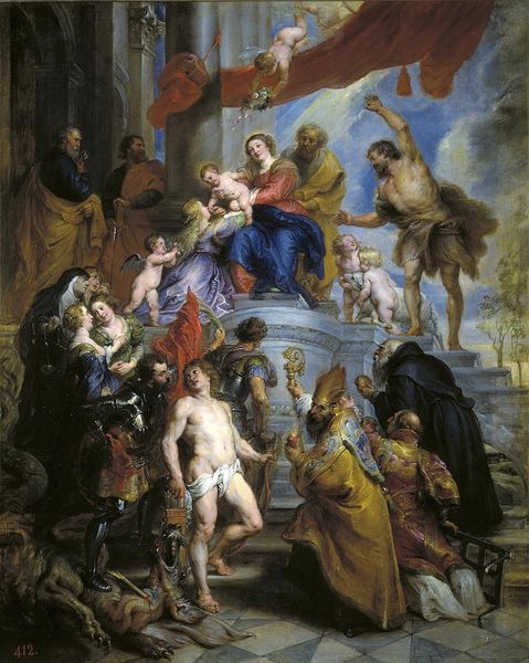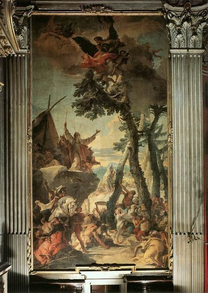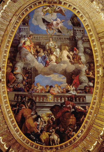 Curator: What immediately strikes me is the painting’s dynamism; it is swirling, overwhelming even. Editor: Indeed. What you are experiencing is not accidental, for this Baroque canvas by Francesco Solimena, painted around 1715, depicts "The Massacre of the Giustiniani at Chios," now hanging in the National Museum of Capodimonte, Naples. Curator: Chios… there's a symbolic weight there. It evokes classical histories, but rendered here with such a riotous, almost chaotic energy. Is it intended as an allegory, a representation beyond a simple historical depiction? Editor: Absolutely, we cannot shy away from the disturbing power dynamics in this depiction. The “massacre” frames colonial violence: Ottoman forces targeted the Giustiniani family who governed Chios under Genoese rule. Look closely at who's on top, and who is at the bottom. Curator: There's an obvious asymmetry—victors and vanquished. But I am drawn upwards. Do you notice the idealized figures above, floating amid the chaos? It's such a contrast, almost heavenly, set against the grim brutality below. What cultural memory is Solimena seeking to create or reinforce with these choices? Editor: I am more interested in challenging any inclination to legitimize power structures depicted, or how they reflect his political climate. Was he deliberately crafting a narrative that serves certain interests? Did his patrons believe his version of the massacre would serve some benefit to them? Those angels hovering above feel, at best, disconnected, and at worst, complicit. Curator: So you’re seeing a deliberate, politically motivated misrepresentation. And what of Solimena himself? He surely knew the symbolic weight of depicting war. The angels themselves…do you not think there is symbolism within their arrangement and gaze, a potential commentary beyond simple heavenly approval? Editor: I hesitate to dissect it in terms of timeless symbolic meaning as I am certain the cultural and historical contingencies surrounding its production cannot be underestimated. For example, were these “angels” not figures of privilege, oblivious to the human cost of expansionist conflicts and domination? Curator: I can appreciate that perspective; it tempers a rush to timeless interpretations. Perhaps the unresolved tension, between the ideal and the real, the heavenly and the earthly, is precisely the point—a mirror to the complexities of history itself. Editor: It makes me think about how history is retold through an artwork’s patron and context, doesn't it? Art isn’t created in a vacuum; that's where power dynamics and politics take center stage.