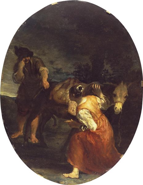 Editor: We're looking at "Don Quixote and Sancho Pansa Having a Rest under a Tree," an oil painting by Honoré Daumier from 1855. There’s a sense of weariness in this image; the figures seem so still against a very muted landscape. What can you tell me about this work? Curator: Well, looking at this from a materialist perspective, notice how Daumier renders the scene with these thick, almost muddy strokes of paint. The materiality itself speaks to the toils of labor. How does the application of paint impact the feeling of the narrative? Editor: It definitely emphasizes the figures’ fatigue and struggle. I guess it mirrors the difficult realities they face in Cervantes' story, even romantic heroes like Don Quixote are not excluded from needing rest after difficult journeys and failed pursuits. Curator: Exactly! Daumier used lithography extensively to comment on social issues; think about that democratized medium here expressed through oil paint and the elevated form of the heroic figure, who are we making a hero here? Is it the individual, the myth, or the workingman who continues even after failing? He isn't portraying gods or royalty but ordinary figures in a recognizable, albeit romanticized, landscape. What do you make of the context of the artwork's time? Editor: Romanticism focused so much on emotions and individualism, which you see here, but this image also seems to be commenting on those very themes, maybe a pre-cursor to realism? This invites contemplation on not only the emotions of these people but also their tangible circumstances. Curator: Precisely! So, thinking about it, how can we view Daumier's choice of oil, typically reserved for high art, and subject matter here in connection to his lithographic work commenting on social issues? Editor: So it blurs the lines between "high" and "low" art to ask questions about society? High art to ask viewers to focus on low labor conditions! Thank you! Curator: Yes! Considering the means of production really transforms how we appreciate the piece.