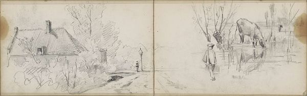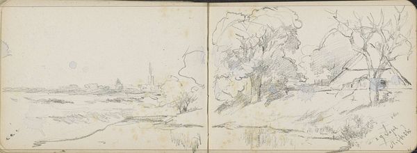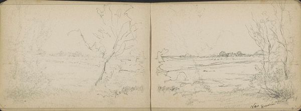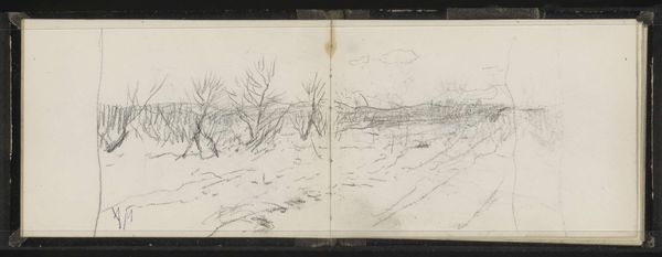 Editor: Here we have Willem Cornelis Rip’s "Brug bij Steenbergen", a graphite drawing created around 1896-1897. It’s interesting to see an impressionistic style used in a drawing rather than painting. What catches your eye, looking at this work? Curator: The composition. The use of the sketchbook’s central crease as a vanishing point is particularly compelling. The implied lines lead our eye directly into the represented space. The graphite work, although delicate, possesses a clear structure. Note the varying densities that establish form, moving beyond pure contour. How do you perceive the materiality of the work itself? Editor: I think the roughness of the medium helps capture the fleeting quality of an impressionistic landscape. The loose application lends an atmospheric quality that feels very transient. But is the division down the middle intentional? Or just an unavoidable aspect of the sketchbook? Curator: Functionally, the sketchbook’s format enables a bilateral symmetry, subtly reinforcing the bridge motif. The left and right panels offer a visual mirroring, establishing balance within the sketch. Consider the spatial effect. Are we looking *at* the scene or being invited to step into it? Editor: I see what you mean about stepping into the space. That central line functions as a kind of path. It pulls me in. I hadn't really thought about how the physical form of the sketchbook adds to the meaning of the drawing. Curator: Exactly. By examining how form shapes our engagement with this landscape we begin to more clearly apprehend the artistic decisions made by Rip.