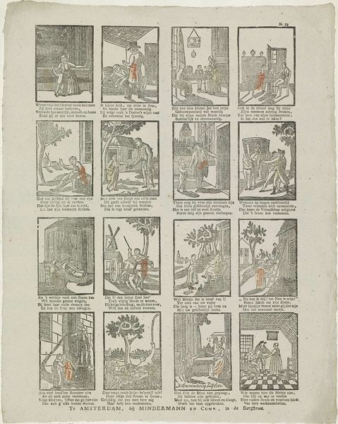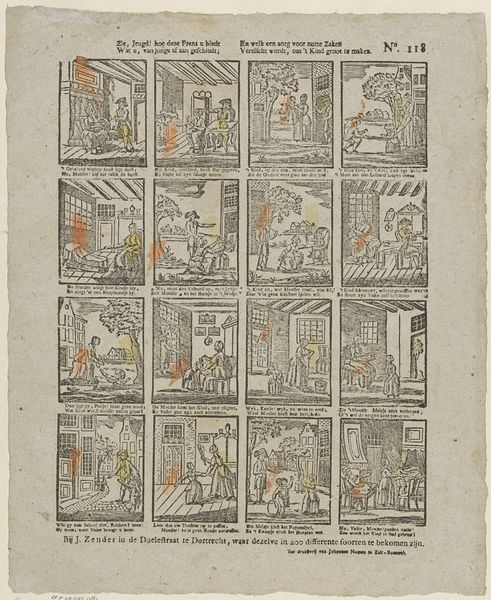Editor: This is a print from the Rijksmuseum called "Ô lieve kindren! wie gy zyt. / Besteed met nut uw dierbren tyd (...)," made between 1791 and 1812 by Jacobus Thompson. It's an engraving in ink. I’m struck by the grid of little scenes, almost like a comic strip, and the slightly naive drawing style. What can you tell me about it? Curator: Well, immediately I'm drawn to the print medium itself. Consider the labour involved in producing multiple copies of this educational narrative. The etching process, the inking, the pressing... each step implicates a whole network of production and distribution. It makes you wonder about the social context: who was consuming these prints and how accessible were they to different social classes? Editor: So you're saying the *making* of the print, its physical production, tells us something important? Curator: Precisely. And the text too. Who decided that children needed these specific lessons, and how were these prints distributed among the populace? The interplay between image, text, and material execution offers a rich understanding of the period's didactic culture and emerging capitalist system. Notice that the publisher's information is printed directly on the piece, which, too, acts as another mode of marketing. It speaks volumes about the evolving market for such goods and the means of production in 18th-century Holland. Editor: It's fascinating to consider the print as a commodity, not just an artwork! I never would have looked at it that way. Thank you. Curator: Indeed, every object holds within it an embedded account of labor, and reflecting upon such dimensions reveals much that would otherwise be lost.