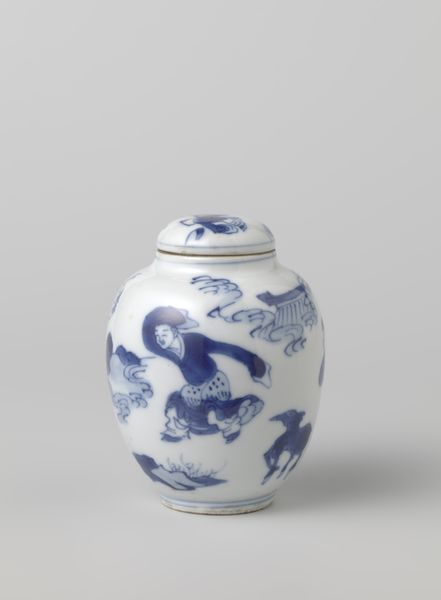 Editor: So, this porcelain jar, dating from around 1680 to 1720, at the Rijksmuseum, is credited to an anonymous artist. What a stunning object! It is decorated with floral motifs and, interestingly, these medallion images featuring what looks like scholarly objects. What do you make of its reserved yet intricate design? Curator: It whispers stories, doesn't it? Imagine someone carefully placing this on a mantelpiece centuries ago. The blue and white porcelain aesthetic, reminiscent of the iconic Ming dynasty, gained enormous popularity globally during the baroque period. The floral scrolls you noticed intertwine with medallions presenting curated “precious objects,” indicating wealth, scholarship, or perhaps even spiritual values. The stoneware surface looks quite lovely. What's your interpretation of the snake-like detail emerging from the vase? Editor: That detail gave me pause, it felt almost whimsical among these other serious, erudite images. Do you think it holds symbolic value beyond just mere decoration? Curator: Oh, absolutely! Snakes, especially during this period, were richly symbolic. It could represent wisdom, healing, or even immortality, depending on the cultural lens we are applying. The anonymous nature of the artist also begs the question: was this a collaborative effort, or the work of a single, unsung master? The mystery enchants me as I gaze at it! Does its scale – its almost unassuming presence – change how you experience it? Editor: That's such a good question. Initially, I missed all that symbolic depth. It highlights how important historical context is. It makes you wonder, right? I appreciate the jar much more after discussing these fascinating cultural clues! Curator: Precisely! It is like unlocking secrets within layers of art. The process encourages a deeper connection. I'll carry its hidden symbols with me as I encounter new works.