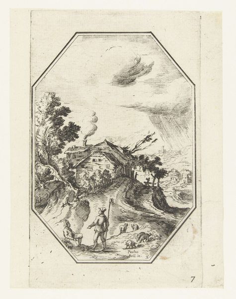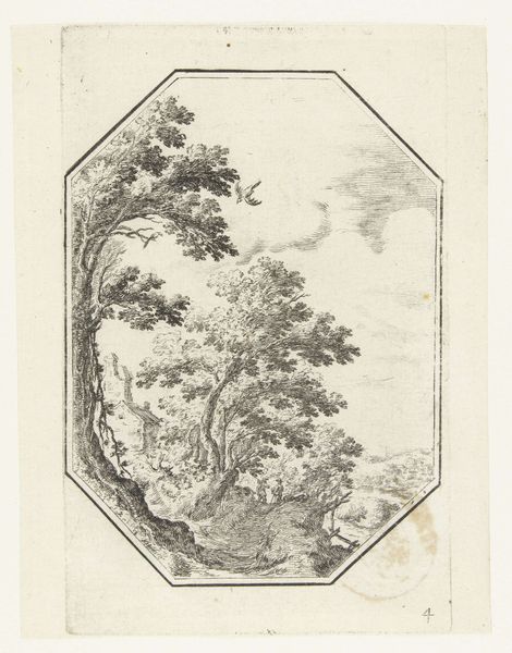 Curator: This print, "Landschap met houten brug in octagonaal kader," translates to "Landscape with Wooden Bridge in an Octagonal Frame," and it dates from between 1582 and 1700, part of the Rijksmuseum's collection. It's attributed to an anonymous artist, crafted using etching techniques. Editor: Immediately, it strikes me as an almost contained wilderness. The octagonal border acts as a kind of lens, sharpening the contrast between the rough, natural elements and the geometry of its edge. The high contrast intensifies the atmospheric perspective, making the whole scene look almost like a dream. Curator: Yes, the framing certainly draws attention to the artist's rendering of an idealized landscape. The wooden bridge, the winding stream, and even the figure crossing seem to harken back to an almost Arcadian past, speaking to the enduring human desire to find harmony in nature. Editor: Absolutely, the bridge, even though it's small, functions as a potent symbol of passage, linking distinct yet intertwined segments of our mental terrain, especially in landscapes of emotional projection. It almost acts as a fragile connection in this somewhat theatrical space. Curator: And bridges always symbolize passage, the link between worlds—whether physical or metaphorical. The single figure further accentuates the sense of solitude and individual journey, a key concept within the landscape genre during this time, as humans found themselves separate from the natural world in new ways. Editor: It's a world viewed from the outside, though—a miniature drama enacted under our gaze. I find it curious, even slightly unnerving, the way it holds the eye so precisely while remaining untouchable. Curator: I agree. There's a layer of historical contemplation embedded in what seems a deceptively simple depiction of nature, an interesting commentary about man and the wilderness. Editor: The careful, deliberate details elevate this, for me, beyond simple observation, to a rather unique composition of shapes and contrasts, the visual balance really heightens its dreamlike quality. Curator: It's a subtle blend of technique and imagery, all meticulously crafted, reflecting the ideals of its period in this small yet complex world. Editor: A concise yet resonant meditation on space and separation... Fascinating.