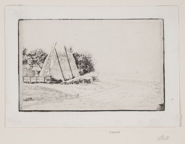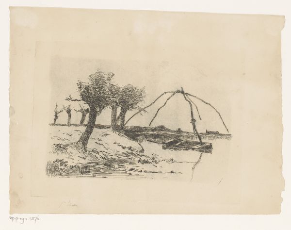 Curator: Ah, here we have Lodewijk Schelfhout’s "Winterlandschap met schuit, hooischuur en vogels," created around 1940. It’s a drawing, an ink on paper print, now residing here at the Rijksmuseum. Editor: Brrr, that's the first thing I feel! It's bleak. Like a memory fading, rendered in delicate scratches. I almost feel colder just looking at it. Curator: Indeed, the monochromatic palette and sparse composition contribute to that feeling. But consider the enduring symbolism of winter landscapes. They often represent dormancy, reflection, a turning inward, and a cycle of decay and rebirth, not solely negativity. Editor: I get that intellectually, the whole Jungian wintering thing. But emotionally? That lone bird perched on the branch – it's not hopeful, it's… exposed. Vulnerable. Curator: Birds, throughout art history, are rich with layered interpretations: freedom, the soul's journey, messengers between worlds. In a winter landscape, though, perhaps that vulnerability is precisely the point. It confronts us with our own fragility in the face of nature’s indifference. And then you have the boat, also. Think about its journey on these barren waters! Editor: Okay, true. The bird and the abandoned boat do feel connected in that regard. Speaking of, the hay bale is rather striking with that darker hatching surrounding it. Almost like a silhouette standing defiant against the emptiness. Curator: Note the artist’s technique as well. It has that feeling of sketching directly from life—very raw. The details become minimized for that immediate transfer of vision from landscape to paper. Editor: Right. And perhaps there's even a hint of… dare I say it… dark humor? The scene is austere, yes, but also a bit like a stage set. This bird! This haystack! It's absurd, in a way. A very Dutch sort of absurd, maybe. Curator: Well, certainly, it fits into the traditions of Dutch Golden Age landscapes. The flattening of the landscape itself allows the symbolic content to resonate powerfully. It evokes a sense of time—and timelessness. The artist presents a single, symbolic scene; a specific season meant to be perceived on a longer scale of passing time, not as a snapshot of a moment in a certain space. Editor: That makes it more relatable somehow. A recognition that the seasons of life also apply on the larger world as well, and here is the artist showing a winter one. It also hints about how art functions as a time-stopping device as well. Thank you! Curator: An excellent point. A work offering the space to contemplate the enduring cycles that shape our existence and art's function within these reflections.