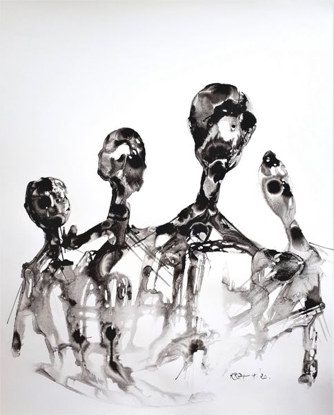 Curator: This striking ink drawing is entitled "The Shooting Gallery VIII" created in 1940 by the Czech artist Toyen. Editor: It's immediately unsettling, this vast, barren landscape populated by what look like… busts and walnuts? There's a real starkness to the contrast between the delicate lines and the disturbing imagery. Curator: Disturbing indeed, and indicative of the tense socio-political climate. Toyen was a key figure in the Czech Surrealist movement, and her art often grappled with themes of alienation and anxiety, particularly under the rising threat of fascism. These figures remind us of the traditional forms used in official portraiture and statues of historical and political persons; instead, however, Toyen gives us very individual symbolism. Editor: Look at how precisely she renders the textures—the smooth 'skin' of the busts, the intricate cracking on the walnuts... Each is crafted as if its material matters profoundly. What about these objects: a ballerina holding a barbell on one, cutlery on the other, those stylized 'a's above the eyes, these scattered like landmines? Curator: Exactly! The objects are deeply symbolic, referencing perhaps societal expectations placed upon individuals or even alluding to domesticity and aggression. In pre-war Czechoslovakia, artistic circles were highly politicized, and Toyen used Surrealism as a tool for subtle, yet potent, social commentary. Editor: The ink feels significant too; its relative cheapness, and ability to duplicate the sketch on different paper qualities speak of art's increasing role as reportage as totalitarian regimes increased production and economies shifted focus away from aesthetic enjoyment toward commodity functionality. Curator: That is right; the accessibility of such techniques allowed for circulation and communication. And "The Shooting Gallery VIII", in its enigmatic way, is testament to Toyen’s unwavering commitment to expressing the anxieties of her time. Its surreal composition resonates deeply with the sense of dread looming over Europe during the late 1930s. Editor: For me, analyzing it by materials really gives new perspective on it. The piece, however small in size, achieves tremendous evocative weight because of this. Curator: Agreed. Toyen encourages viewers to grapple with uncertainty and find their own meanings in this surreal tableau.
