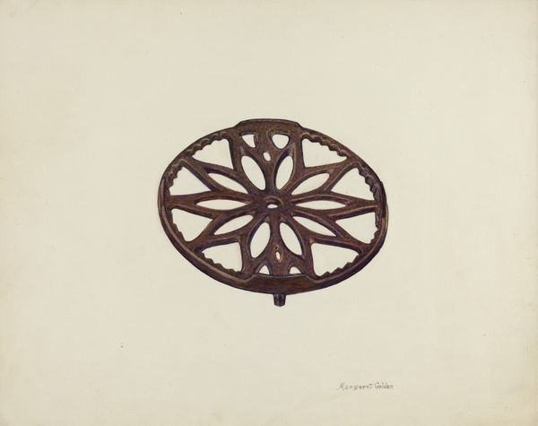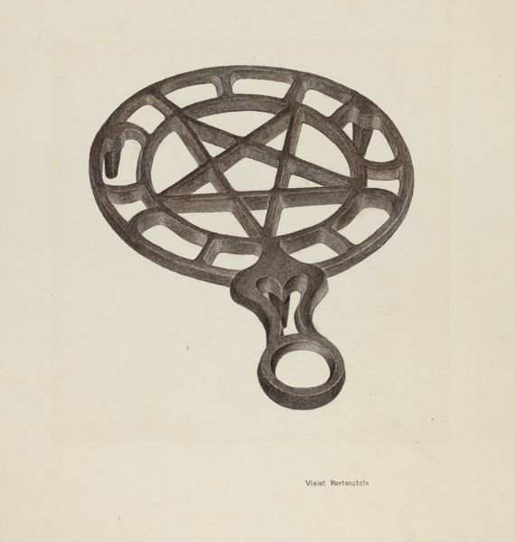 Curator: Here we have Sydney Roberts' 1941 drawing entitled "Trivet," rendered meticulously in pencil. Editor: It strikes me as very solid. The careful shading suggests weight and sturdiness, like it could easily protect a tabletop from a hot dish. Curator: Yes, a trivet is nothing if not functional, and that functionality informs Roberts' approach. The precision of the pencil work emphasizes the manufacturing process itself. The inscription "Enterprise MFG. Co. PHILADELPHIA" isn’t just decorative. It grounds the piece in the context of American industry during a pivotal time. Editor: I’m drawn to the geometric patterns within. The wheel-like design evokes both a sense of forward motion, symbolic of industry, and perhaps an ancient solar symbol. Also, the shield-like shape itself… a sense of protection? Not just of the table but something more. Curator: I think it speaks more to the value of everyday objects during the 1940s. Consumer goods, while readily available to some, held significant value in middle-class households, given factory production was gearing toward military equipment, changing the landscape of American Material Culture. It really highlights the intersection of labor, manufacturing, and domestic life. Editor: Maybe so, but I can't dismiss the feeling that this unassuming kitchen item carries the weight of something beyond its utilitarian purpose. The shield and the radiating lines...they tap into something primal, a yearning for order and security perhaps felt acutely as global conflict intensified. It's not just about what it does; it’s about what it represents, about deeper cultural anxieties and longings made visible through a humble object. Curator: So you're saying a trivet can be a window into the collective psyche. Well, either way, Roberts elevated what might have been a mere diagram of domestic life into a study of production. Editor: It makes one consider the stories behind these commonplace items and how they can mirror universal, enduring human themes.