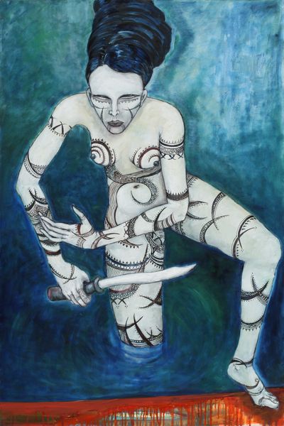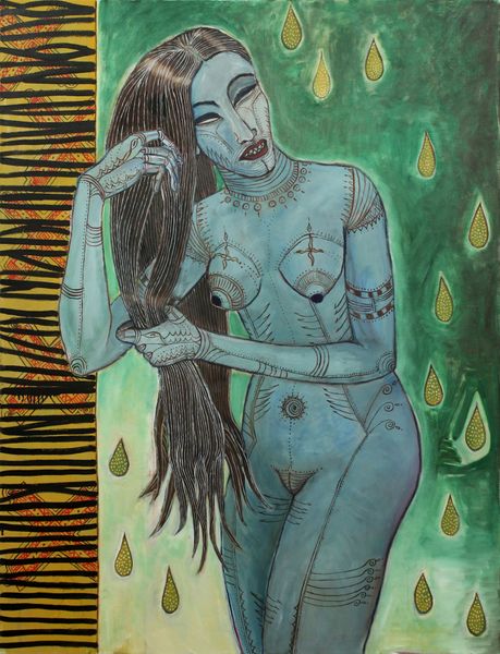 Manuela Sambo painted this striking image, *Frau mit Spiegel*, using oil on canvas. The palette is pretty limited, but the colours are mixed in such a way that the skin takes on a luminous, almost otherworldly quality. It is as if the figure is emerging out of the canvas. The thin black lines give a sense of structure, but look closer, it’s not really how bodies are structured, is it? There is something both sensual and unsettling about this vision. I’m drawn to the yellow cloth and the strange rose background. It brings to mind Paula Modersohn-Becker’s radical self-portraits, in which the artist explored the female body with similar freedom and emotional depth. This is not just about appearance; it’s about the inner self made visible, inviting us to consider the multifaceted nature of identity.