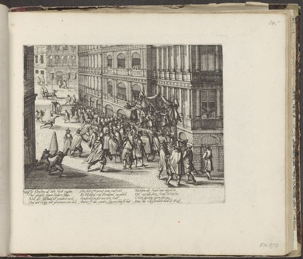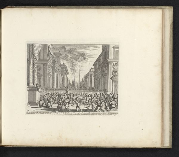 Melchior Küsel’s etching, Verloochening door Petrus, presents a densely populated courtyard scene, rendered with meticulous detail in blacks and whites. The overall composition, teeming with figures clustered around a central fire, is framed by the stark architecture of classical buildings. The artist employs hatching and cross-hatching to modulate tones, creating a dramatic contrast between the firelight and the encroaching darkness. This technique not only highlights the central narrative—Peter's denial of Christ—but also imbues the scene with a sense of moral ambiguity. The architectural elements, rendered with precision, serve as a backdrop that both contains and comments on the human drama unfolding within. The spatial arrangement, carefully constructed, guides the viewer's eye through the scene, emphasizing the psychological tension between Peter and his accusers. The etching's formal qualities—its use of light and shadow, its detailed rendering of architectural space—collectively underscore themes of denial, betrayal, and the interplay between individual conscience and societal judgment.