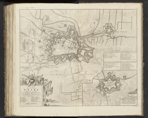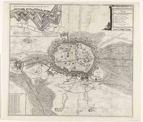Editor: Here we have "Siege of Aire, 1710," by Jacobus Deur, a print utilizing etching and engraving techniques. The city appears almost as an organic, fortified growth on the landscape. How do you interpret this work? Curator: This isn't just a picturesque view; it's a carefully constructed representation of power and control, meticulously crafted for strategic, often propagandistic purposes. Let's consider the materiality of the print itself. Engravings like these weren't just art; they were commodities, reproduced and disseminated to inform and influence public opinion regarding military campaigns and geopolitical interests. The detailed rendering signifies meticulous planning, the sheer labor invested in creating this object mirroring the investment in the siege itself. Notice the geometrical forms—how does that connect with the military objective of the artwork? Editor: The fort's star shape stands out, seeming both beautiful and menacing in its exactitude. Curator: Exactly! This geometrical precision speaks to the burgeoning field of military engineering at the time. The very act of mapping, etching, and printing reflects an effort to dominate not just the territory but also the visual representation of that territory. The lines, the annotations, are a form of claiming space, turning it into a commodity. The production process mirrors the process of conquest. What does this suggest about how maps themselves function? Editor: I see how the materials used contribute to this representation of power through labor. Curator: Precisely. Now we understand the piece is about both craft and consumption and how they are intertwined with the labor of production. Editor: I hadn’t considered it in those terms before, that’s an interesting perspective!