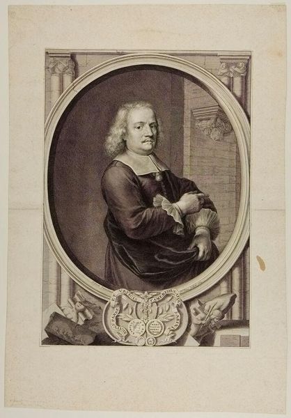 Curator: This is Johann Georg Wille's engraving of Louis XV, King of France. It's striking how somber it feels. Editor: Indeed, the engraving technique emphasizes line and form, creating a sense of gravitas. The King's distant gaze seems heavy with the weight of leadership. Curator: And the symbols surrounding him speak volumes about the monarchy’s intersectional narratives. The laurel wreath, the armor, the suggestion of classical sculpture. It's all carefully constructed. Editor: The composition is remarkable. The oval frame around the bust draws your eye, while the objects at the base act as a visual anchor, balancing the composition. Curator: But these symbols also represent the King’s power, which historically meant the oppression of marginalized people. It’s important to acknowledge that. Editor: I agree, and the artistry lies in how Wille uses these symbols to portray power, regardless of its morality. The precision and the detail are exquisite. Curator: It prompts us to reflect on how power is represented and the stories these representations tell, both intentionally and unintentionally. Editor: Precisely, and I am reminded of the brilliance of the technique. Curator: Thank you for shedding a new light on this engraving. Editor: A pleasure, the complexities of it are wonderful.