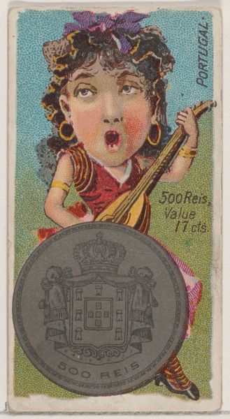 Curator: This eye-catching image comes to us from 1889. It is titled "Newfoundland, Two Dollars," and is from the series "Coins of All Nations" created for Duke brand cigarettes. Editor: It's wonderfully weird. The juxtaposition of this caricatured figure, like a folksy explorer holding what looks like a lantern, with an actual Newfoundland two-dollar coin is unexpected. There's a quirky, playful feeling, despite the sort of worn look. Curator: The entire series speaks volumes about how tobacco companies used visual culture to brand themselves, creating associations with wealth, travel, and… otherness. The exaggeration of facial features, for example, was a common trope when portraying people from different lands. Editor: I agree; seeing it as part of a larger series changes the meaning. It speaks directly to commodity culture and exoticization. Note the "Value $1.95c"—a direct tie-in, transforming human image and monetary worth into a sellable experience for mass consumption. I wonder about the actual methods involved in its printing: the paper quality, color processing. Curator: Precisely. And the choice of the lantern, glowing faintly, may carry the implication of guiding lost souls in Newfoundland or perhaps it speaks of prospectors during a gold rush—all connected to wealth. Its cultural baggage becomes pretty heavy, doesn’t it? Editor: Absolutely. And it also reveals class divides. Tobacco was cheap, available to anyone, even working class, but now suddenly one gets glimpses of "far away" and gets reminded about things one does not have in one’s possession! Curator: It becomes apparent that the creators employed the imagery from the numismatic universe as symbolic signifiers. One could almost see this specific piece as an echo of imperial power dynamics filtered through popular entertainment. Editor: Right, we shouldn't forget this was meant to be a piece of marketing, crafted with intentionality to sway perspective in line with commercial aims. Makes you see it differently when you're considering things in economic and labour terms. Curator: When you delve into these historical currents—the layers of meaning in this artwork is striking. Editor: Definitely gives one more to ponder about everyday objects, doesn't it?