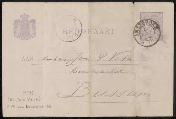 Editor: This is a piece called "Briefkaart aan Philip Zilcken" by Willem de Zwart, created before 1888. It’s an ink and watercolor drawing on paper, essentially a pen sketch on an old postcard. What immediately strikes me is its vulnerability, with those stains contrasting against the neat handwriting. What do you see in it? Curator: I see the cultural role of correspondence at that time. Before telephones became ubiquitous, postcards were vital for communication. Consider the postal infrastructure implied here: the Dutch coat of arms, the pre-printed "BRIEFKAART," and the postmark – all signifying a state-sanctioned network connecting individuals. Who was Philip Zilcken in the art world? Editor: That’s interesting. I hadn't considered the infrastructure aspect. I don’t know, actually; that’s a great question. Curator: Zilcken was an artist, critic and printmaker with international connections. It makes me wonder what function these brief words fulfilled. It reads, across the center in a very thin scrawl ‘Van wie dat adres’ which roughly translates to “from whom is this address?” - indicating it was merely utilitarian in its function, and that visual economy emphasizes a reliance on these postal services for social and artistic exchange. It seems like this simple address highlights this art of exchange more than just communicating a single purpose. Editor: So, even a seemingly simple object like a postcard can reveal so much about communication and social networks of that era? Curator: Exactly! It prompts questions about the relationship between de Zwart and Zilcken, the role of artistic networks, and the socio-political context that enabled their exchange. Even stains mark it. The stains can symbolize chance encounters, imperfections in a formalised method - something tangible for us in viewing art through social interaction. Editor: That gives me a whole new appreciation for this piece. Curator: And me too! It is nice to slow down and acknowledge what things like simple gestures on postcards meant for human exchange, it changes the viewing experience and acknowledges what things of our current daily exchanges might tell others centuries down the line.