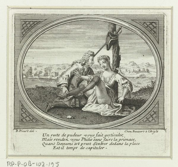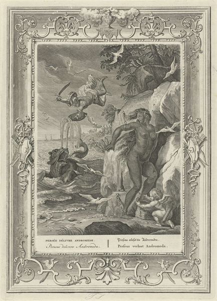Editor: This is "Deucalion and Pyrrha create a new race of people," an engraving by Bernard Picart from 1731, currently at the Rijksmuseum. It’s interesting how he captures such a dramatic myth with delicate lines. What do you make of it? Curator: Well, for starters, isn't it fascinating how a story of near total annihilation can lead to rebirth? Pictart really nails the dramatic sweep. The figures feel like they are emerging from a nightmare and stepping hesitantly into dawn. Those nude figures could have been from the Golden Age of Venetian paintings! Editor: Definitely! It almost seems like Picart is mixing stark despair with optimism. The light and shadow definitely lead you to see new hope from despair. Do you think Picart had any message for the people back then? Curator: I believe so! Back in 1731, people yearned for better things, yet Europe seemed stuck with the aristocracy. So it seemed people then also were eager to make something better, just as these mythological characters made humans from stones. Now, what about that ornate border? Does that speak to you in any way? Editor: Oh, yes. It really emphasizes the engraving itself, as if to elevate this particular view of the myth. And somehow, it transforms what would be a landscape into something much more profound! Curator: Exactly! This border invites viewers to imagine all kinds of scenarios, as if each little embellishment holds a different secret. What did we learn? Mythology can bring forth creative storytelling even when times were tough. Editor: I'm going to think twice the next time I pass by an engraving! It truly encapsulates so much cultural meaning within such carefully constructed lines.
