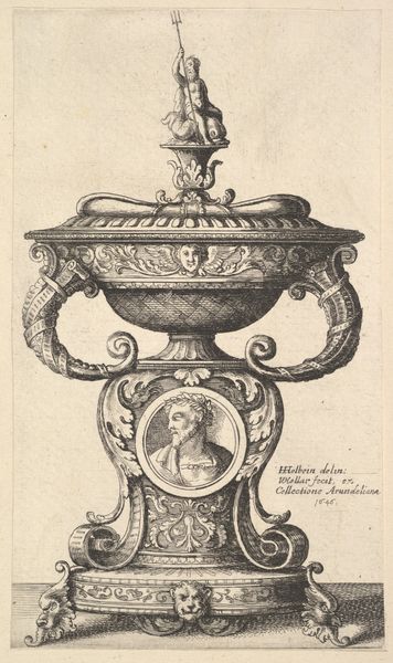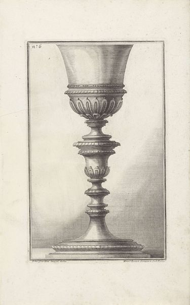 Editor: So, we're looking at "A wide cup with ball feet" created in 1646 by Wenceslaus Hollar. It's an engraving, giving the metalwork depicted a fantastic shimmering effect. I find it interesting how it elevates an everyday object, what can you tell us about this piece? Curator: What’s immediately striking is that this print mediates an object for elite consumption, probably silver or gilt. Hollar doesn’t simply depict it; he renders its textures and intricate details. Notice how the engraver carefully articulates the ornament; the status and aspirations of those who commissioned such elaborate pieces is literally materialized within this image. How do you think this print alters the nature of that consumption? Editor: That’s a good point, the print flattens it, making it widely available in a way the object itself never could be, democratising it in some sense. Would such a print serve a practical purpose as a record or even inspiration? Curator: Precisely. This image allows the sharing of luxury across geographical and social boundaries, influencing taste and material aspirations. Furthermore, it provides workshops and artisans visual models, fueling and standardising production of fashionable goods on an expanded scale. Where would you locate this piece on the spectrum between art and craft? Editor: I think this piece really breaks down the divide between the two, it highlights skill and precision as an artisan’s proof. It suggests that craft objects hold the same design considerations as something we may see hung in a gallery. Curator: Exactly. It urges us to reconsider hierarchical categorisations of artistic labour. Reflecting on the production process reveals so much more about both the object and its cultural context.