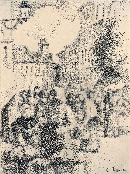 Curator: The Tate holds this piece by L.S. Lowry, titled "The Three Cats, Alstow." It seems to depict an ordinary street scene. Editor: Immediately, I’m struck by the starkness of it. The limited palette and simplified forms create an atmosphere that's both bleak and strangely vibrant. Curator: Lowry often portrayed working-class life in industrial England. It's fascinating how he captures the feeling of community alongside the realities of urban life. What do you think about the cats featured here? Editor: Their presence is intriguing. They appear as dark silhouettes, almost like little shadows, adding a touch of mystery to the overall composition. They create an almost surreal edge. Curator: Precisely. They are not simply pets, but symbols reflecting the lives of those whom society forgets. Lowry's work provides a lens through which we can examine the lives of the disenfranchised. Editor: It is through its formal simplicity and constrained palette, that such depth of human experience is felt. Curator: A striking piece that gives voice to the everyday. Editor: Indeed, a testament to the expressive power of simple forms.