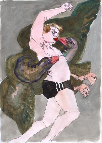 Vlada Ralko made this watercolor painting, Kyiv Diary, using paper and layered washes. I love the controlled chaos here. The way the colors bleed, it’s a real testament to the artist surrendering to the medium and letting it do its thing. Look at the masked figure, holding a Molotov cocktail in one hand and what looks like an eclair in the other! The pinkish wash of the flames echoes the eclair, this really gets me thinking about contrast. There's something unsettling and yet very human about this juxtaposition of violence and snack. The black marker outlines give the piece a graphic, almost cartoonish edge. Ralko's work reminds me of Philip Guston, who used a similar simplified, almost clumsy style to engage with difficult subjects. Like Guston, Ralko isn't afraid to embrace awkwardness and ambiguity. It's a painting that asks more questions than it answers, and that, to me, is what makes it so compelling.