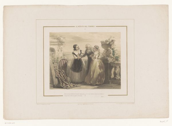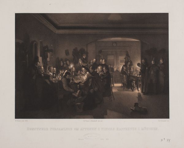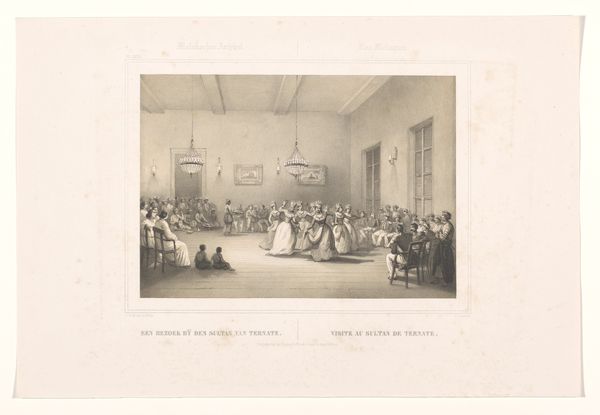 Curator: "Gezelschap bekijkt aquarellen in een rijkelijk gedecoreerd interieur," or "Company viewing watercolours in a richly decorated interior", a print from 1836-1837 by Jean-Baptiste Madou, here at the Rijksmuseum. Editor: What a scene of studied leisure. The textures, from the ornate wallpaper to the sheen of the women’s dresses, speak to a society defined by its possessions and meticulous presentation. Curator: Indeed. And look closely at the lithographic process here, the way Madou builds tone and detail. These prints made images accessible; a middle class could simulate the experience of owning art. Think of it – printed impressions democratizing access! Editor: I see those dresses and they tell a deeper story than just material wealth. The styles, the very cut, the postures—they reflect a performance of social rituals. What hidden messages or accepted norms do these silhouettes project? What’s with the little girl pointing so attentively, and is that a monk sitting by the table? Curator: Excellent point. Religious imagery appearing alongside children symbolises, here, piety and purity, so relevant for that time in society. That little girl is being initiated, instructed, subtly indoctrinated to adhere to this environment’s unspoken codes, which is made palpable in the print's detail, revealing the paper, inks and the pressing that allows the picture to become affordable and widespread. Editor: Affordability aside, there's still a powerful sense of looking IN on a carefully constructed symbolic realm. This carefully lit room—it almost feels stage-like. Notice the large painting just barely visible above the figures in the center of the scene? What power dynamics are reflected, quite literally in its obscured image of presumably wealthy members of that same group? Curator: Exactly! Materially speaking, these prints were crafted to feed a specific market. But its the underlying currents—class aspirations, social anxieties – are so telling when studying artistic production in 19th century society. Editor: Ultimately, "Gezelschap bekijkt aquarellen" uses its visual vocabulary to echo through time; reflecting our desires for beauty, social acceptance, even when printed with black ink on white paper. Curator: Well said, highlighting that the making of art and it's place within the socio-historical narrative of that era.