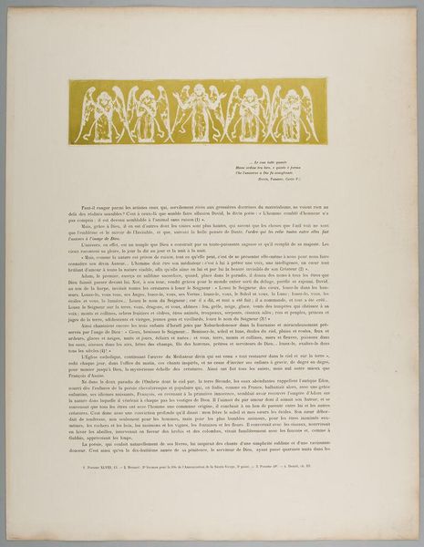 Curator: This work, titled "Border, frontispiece," by M. Simas, is a lovely example of decorative art. It features a central block of text surrounded by a green border of flora. Editor: I'm immediately struck by the intricate detail of the border itself. The artist’s command of line and form is quite impressive. Curator: Indeed. As a frontispiece, its role would have been to frame and introduce the text, setting a tone or theme. The use of natural elements would be familiar to its audience. Editor: The arrangement of leaves and vines creates a sense of movement, drawing the eye around the text. It almost feels as if the words are growing organically from the page. Curator: Absolutely. Consider the period in which this piece was created; it reflects an interest in naturalism, common in botanical illustrations, and thus connects to broader trends in science and publishing at that time. Editor: From a purely aesthetic perspective, the contrast between the precise text and the organic border is visually satisfying. It's a beautiful example of design. Curator: It tells a compelling story about the values and interests of its time. Editor: Yes, a story told in line, form, and balance.