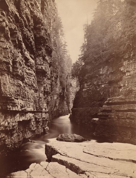 Curator: This is a gelatin silver print by Carleton Watkins, dating to 1867. It is titled *Cape Horn, Columbia River, Oregon* and forms part of the Metropolitan Museum’s collection. Editor: What a powerful composition. The sheer scale of those cliffs reflected in the still water is breathtaking, yet somehow serene. It makes me feel very small. Curator: Watkins, working in the early days of photography, understood the power of landscape to shape and reflect national identity. His work, particularly these images of the American West, were instrumental in promoting the idea of manifest destiny. He received government support due to his skill. Editor: Ah, so we're looking at a visual manifestation of 19th-century expansionist ideology then? It's fascinating how such a tranquil image could also be interpreted as an assertion of dominance. The stark monochrome seems to amplify this sense of stark, almost unchallenged power. The single spire reaching up resonates with ancient architectural symbols too... Curator: Precisely. The sublime nature present connects with a cultural moment where artists depicted nature not merely as a backdrop, but as embodying moral and spiritual significance. This builds on transcendentalist thought too, finding God in the grand scheme. Watkins wasn’t just documenting; he was framing a narrative about the American landscape itself. Editor: I find myself drawn to the textures within the monochromatic scale, from the coarse cliffside to the glassy river. Curator: Watkins used an enormous camera, resulting in incredibly detailed images for the time. It's interesting to note how photography, even in its nascent form, was already being employed to both celebrate and perhaps even sanitize the complexities of westward expansion. Editor: Sanitize, definitely a strong and interesting point there, yes. It is very controlled and presented here. Thanks for offering that rich and interesting interpretation; it makes this landscape more than just scenery for sure. Curator: My pleasure. Considering the Hudson River School origins mixed with expansion, you notice how this work functions as a carrier of a particular, ideologically charged cultural narrative, and for this it continues to spark relevant conversations today.