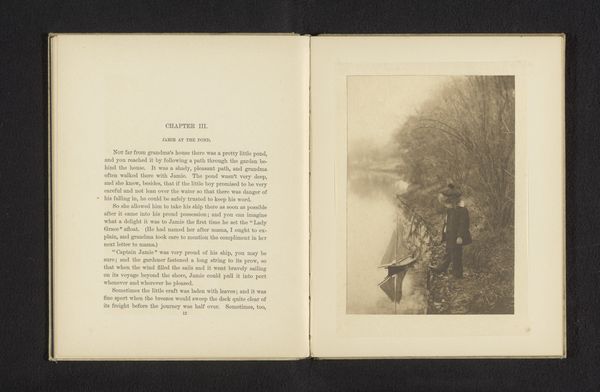 This photograph, 'Jongen op de oever van een waterpartij' by Emma Justine Farnsworth, presents us with a complex interplay of light, shadow, and reflection. The soft, monochromatic tones and the subtle gradations of light across the water's surface immediately evoke a sense of tranquility. Notice how the composition is structured around the vertical axis of the trees reflected in the water, creating a mirroring effect that almost bisects the frame. This formal arrangement destabilizes our perception of space, blurring the boundary between the real and the reflected, the solid and the fluid. The figure of the boy stands at the edge of the water, a point of contact between these two worlds, engaging in the dichotomy of surface and depth. The photographic medium here serves to capture a moment of suspended reality, prompting us to reflect on our relationship with the natural world and our understanding of visual perception.