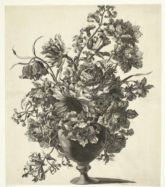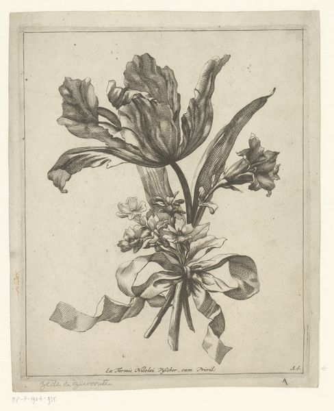 Curator: Here at the Rijksmuseum, we have Jacques Bailly the First’s “Boeket met een narcis, sinasappelbloesem of jasmijn en een iris,” an engraving from around 1670. Editor: It’s incredibly detailed. The textures are so finely rendered, especially on the iris. It's got this kind of delicate, almost scientific feel to it. Curator: Yes, well, botanical illustration had become increasingly popular through publications accessible to a growing middle class, keen to know nature but also consume imagery as a demonstration of their increasing awareness. This print would have met an eager audience. Editor: Exactly! But let's talk about the labor here. Consider the sheer skill involved in creating this level of detail using engraving. The physical effort! We can see the control Bailly had over the tools, transforming base metal into a matrix to disseminate images to a broad audience. Curator: Absolutely, the print medium itself democratized access to imagery previously available mostly through painting for the aristocracy. Furthermore, Bailly came from a family workshop—so that shaped how these images were made and consumed at the time. Editor: I’m curious about the choices he made, like with the light. It almost feels… staged, rather than naturally observed. The shadows are so dramatic for flowers. Curator: True, but it was designed as an object for display. An object which gave its owners access to flowers year-round through a reproducible image that also signaled good taste. It brings an entire network of workshops and aesthetic judgments to your fingertips. Editor: Ultimately, for me, it comes back to process. How the artist transforms metal, pressure, and ink to generate something so delicate. I like the interplay of industry and aesthetics, as it makes this print much more interesting than any botanical illustration. Curator: It shows the expanding art markets of the Dutch Golden Age; consumers could display flowers perpetually, despite seasonality or expense. It serves a very particular purpose. Editor: Precisely. The context informs so much. Curator: Thank you. Editor: Thank you.