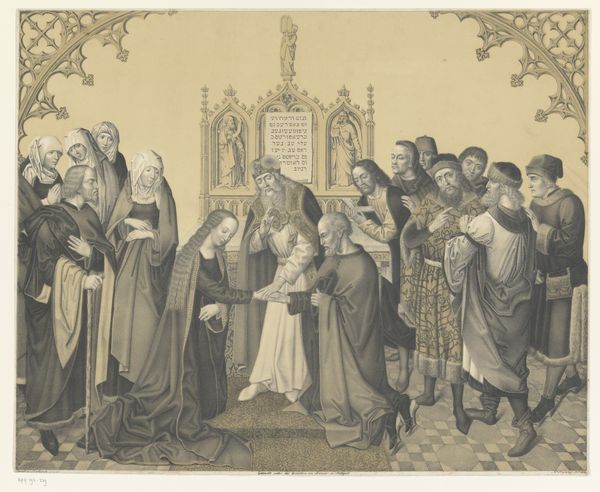 Curator: At first glance, this lithograph, Johann Nepomuk Strixner’s "Adoration of the Magi," strikes me as quite somber, almost sepia-toned in its presentation. Editor: Yes, and that coloring makes the worn texture of the thatched roof particularly evident, contrasting sharply with the precious metal of the gifts. Curator: The gifts are indeed central. The Magi’s presence signifies the recognition of Christ’s divine kingship, echoing prophecies of earthly rulers bowing before him. Editor: I’m drawn to the production of this lithograph – a method that allowed for broader dissemination of such religious iconography. Curator: Precisely! This image serves to reinforce the power and authority of the church, influencing the believer’s experience, regardless of their social position. Editor: So, an accessible object carrying significant symbolic weight, produced to shape spiritual belief, that seems a powerful nexus of material and meaning.