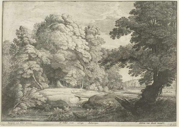 Curator: This is "Landschap met rivier aan de bosrand," or "Landscape with river at the edge of the forest," an etching made by Wenceslaus Hollar in 1649. You can find it here at the Rijksmuseum. Editor: Immediately, I’m struck by the incredible detail Hollar achieves. The density of the trees on the left, balanced by the open expanse on the right, creates a captivating visual rhythm. Curator: Hollar, though born in Prague, was deeply influenced by the Dutch Golden Age, evident in his detailed landscape work, which also speaks to the growing merchant class and their desires to celebrate their world in imagery. Prints became increasingly important at this time in the Netherlands, offering affordable art to a broader public. Editor: And the lines! Look at the differing weights, textures achieved. The foliage is almost palpable, the reflections in the water... the subtle modulation evokes atmosphere so powerfully. The mark-making signifies the light, so tangible that one almost feels the sun’s rays filtering through. Curator: That is so precise, especially considering the social dynamics around art at this moment. There was an increasing fascination with scientific accuracy as the social, political, and financial powers shifted toward those with knowledge, data, and worldly possessions rather than simply titles and inherited positions. Editor: Even with that drive for precision, I can see hints of the Baroque in the composition— a subtle dynamism that invites the eye to wander and take it all in, a play with forms and shadow that really keeps my attention. Curator: It’s hard to overstate how groundbreaking landscape art became during the Dutch Golden Age. For centuries, landscapes were backdrops in paintings; here it comes to the forefront as it never has before and as part of Dutch national pride. It’s not just a pretty picture. This piece highlights how art democratized itself at this period, with subjects easily accessible for many homes. Editor: A landscape with a river indeed—but Hollar elevates the genre, using just lines to signify so much nuance in light and shade, creating this peaceful pastoral scene which is all the more intriguing now knowing its history. Thank you! Curator: Yes, exactly. Appreciating its intersection of artistic form and broad cultural movements makes the piece incredibly powerful to view.
