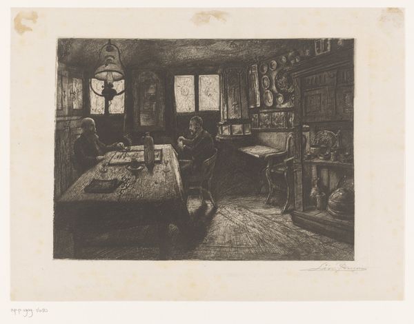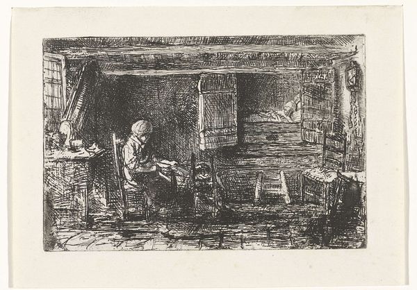 Willem Steelink made this etching, "Woman Watching Over a Sick Person," in the Netherlands in the late 19th or early 20th century. The image encapsulates the domestic sphere and the emotional labor often carried out by women. Note the dark interior and the woman hunched in worry, while another figure lays in bed behind her. The sparse furnishings and dim light suggest a modest, perhaps even impoverished, setting. The scene speaks to broader socio-economic conditions, reflecting on the everyday lives of ordinary people and the ever-present struggles with illness and hardship. Art historians can look at census records, social surveys, and medical reports of the period to understand the anxieties that are reflected in this artwork. The image reminds us that art is not just about aesthetics; it's a cultural artifact embedded in specific historical circumstances.