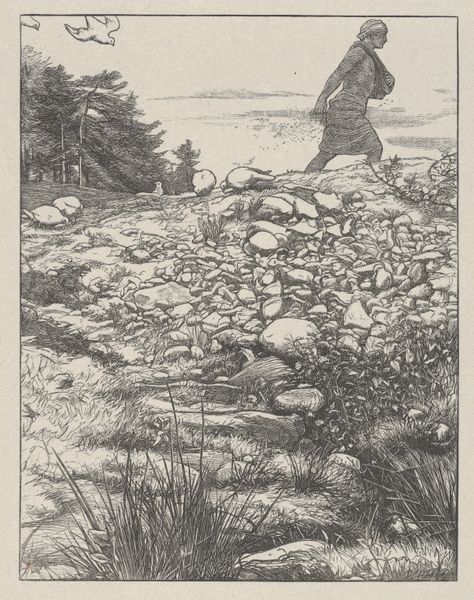 Sir John Everett Millais created this print, "The Hidden Treasure," part of "The Parables of Our Lord and Saviour Jesus Christ." This was during a time when religious and moral themes were prominent in Victorian art. Millais, associated with the Pre-Raphaelite Brotherhood, often explored themes of morality and salvation, deeply resonating with the religious sentiments of the Victorian era. In this print, we see a figure kneeling in a field, seemingly fixated on something in the soil, while oxen wait patiently nearby. The image may present the idea of unexpected rewards and the value of seeking inner riches rather than material wealth. The kneeling figure could represent anyone from any walk of life discovering something profound in their ordinary existence. Millais uses a traditional biblical narrative to reflect societal values and reinforce spiritual beliefs. The emotional focus on discovery and spiritual awakening invites us to consider our own searches for meaning. How do we find value in unexpected places, and what does it mean to uncover a hidden treasure within ourselves?