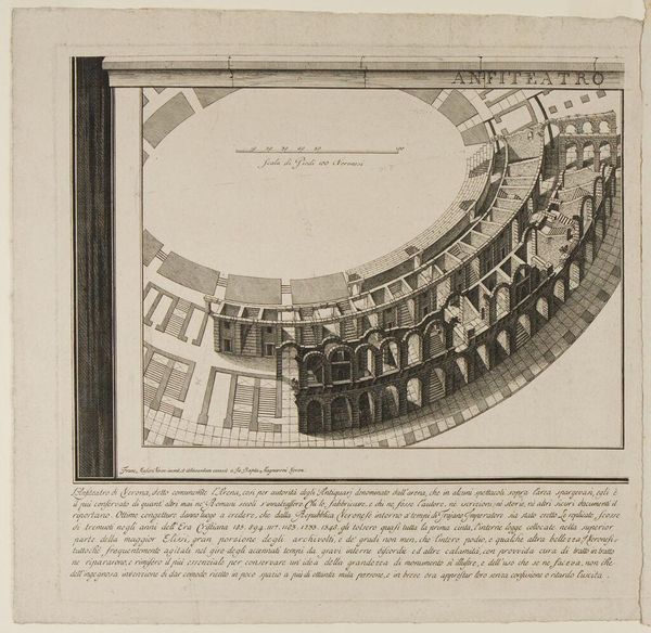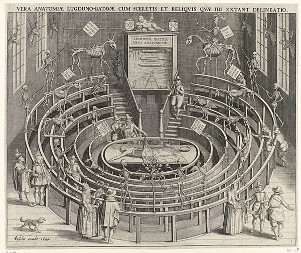 Curator: Here we have an engraving from 1742, "Het Leids Anatomisch Theater," housed in the Rijksmuseum. Editor: It’s rather unsettling, isn't it? Stark light and precise lines detailing a very macabre space. Almost a clinical sense of detachment. Curator: Indeed. What we're seeing is a representation of the anatomical theatre at Leiden University, famed in its day. What strikes me is the way knowledge and performance blend; each skeleton stands presented as a player on a circular stage, almost like a bizarre ballet. There's something ancient and almost ritualistic in its staging. Editor: Ritualistic, yes, and exclusionary. Consider the power dynamics here. A select few – all men, it appears – observe, learn, and ultimately dissect. Where do the dissected figures come from? Who gets to participate in this acquisition of knowledge, and whose bodies are seen as disposable in the name of science? Curator: It’s a valid critique. The skeletons themselves, perpetually posed, could be seen as symbols. Memento mori reminding us of mortality. The gestures seem to point at something larger than just a scientific collection, perhaps indicating our very condition. Editor: While I agree about mortality, I think we have to also note the ways in which science here seems less about death, but rather the active subjugation and manipulation of bodies and knowledge production, primarily for the benefit of a specific class. Curator: Looking at it in terms of subjugation is a lens shift – I suppose it raises the question about how knowledge has been gained at a price. Does science offer redemption, or a history to question and repent? Editor: Precisely. Works like these are powerful in exposing, even if unintentionally, uncomfortable histories, and reminding us that so much of our modern knowledge has complex ethical implications. Curator: Thank you for guiding us. These images resonate and continue to pose very poignant human questions through both what they expose, and conceal.